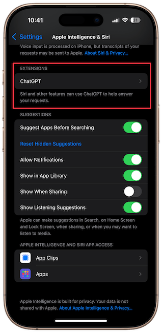 1. To enable ChatGPT on your iPhone, launch the Settings app and open Apple Intelligence & Siri settings.