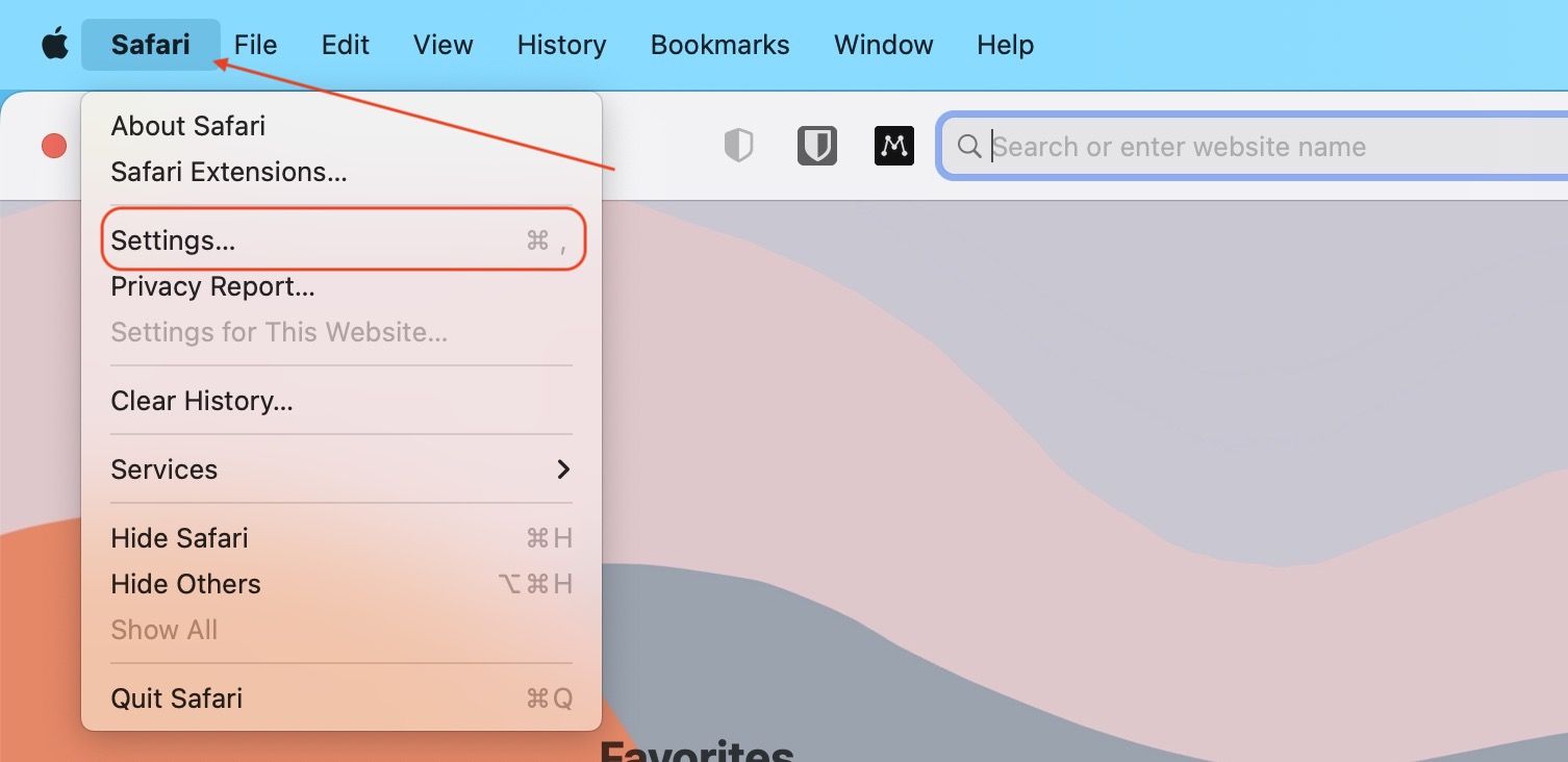 2. Click on Safari in Menu Bar and open Safari Settings. Alternatively, hit ⌘,(CMD+,) keyboard shortcut.