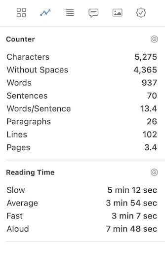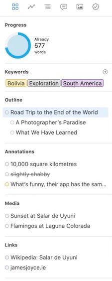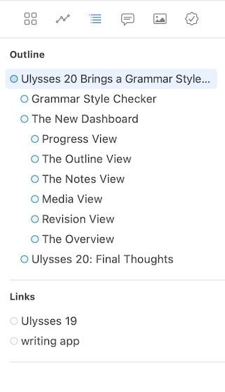 Ulysses 20 is also introducing an all-new Dashboard that gives you access to all the information that is relevant to your text. In the dashboard, you get several views. In the past versions of Ulysses, you clicked on the attachment icon to open the attachments panel. Now, that is replaced with the Dashboard icon (which is the same as the past statistics icon). Clicking on the icon will reveal multiple views. Here are all the views in the dashboard: