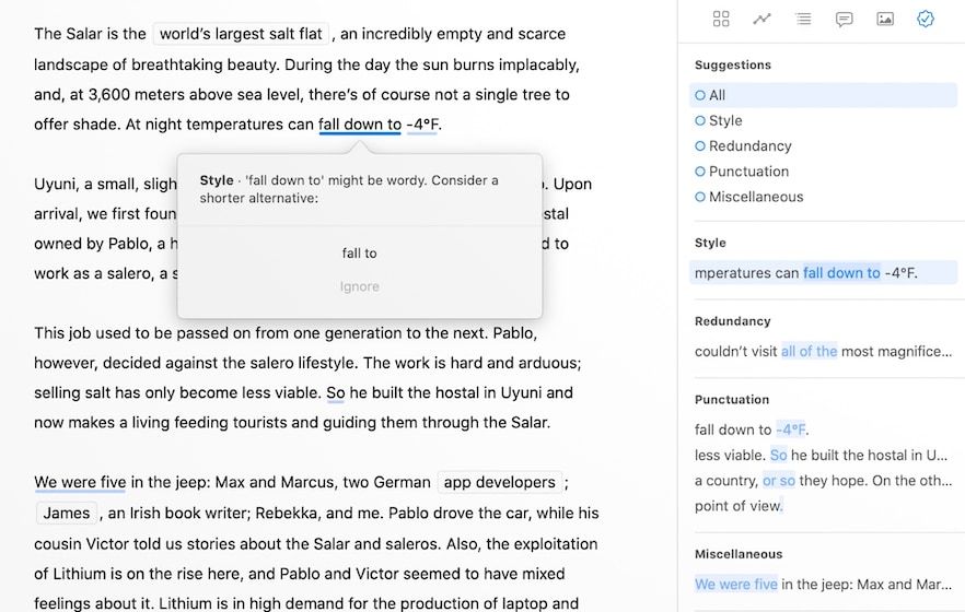 With the new built-in grammar checker, you don’t have to do anything. Now Ulysses itself will analyze your writing using its comprehensive grammar style check tools. Ulysses can analyze texts and provides informed suggestions in categories such as capitalization, punctuation, semantics, redundancy, typography, and style.