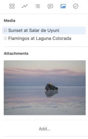 The Media view is also getting new features. Now, not only it stores the images you want to keep for reference but it also shows all the media that you have attached inside the document. And just like the outline view, you can click on the media name to jump to its place in the document. You can also double click on a media file to open it for editing.