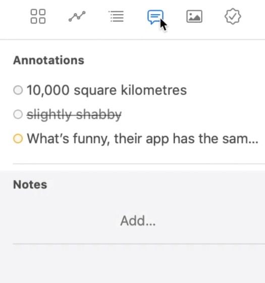 The Notes view is the same as before. Here, you can add notes to documents that you don’t want to show up in the main write-up. As mentioned, apart from notes, it also shows the annotations.