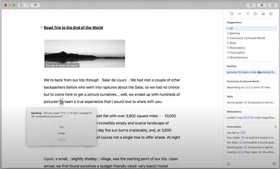 For me, the headlining feature of Ulysses 20 is the new built-in grammar style checker. Most of us use grammar style checking services (Grammarly is the most popular one) for improving our writing. However, using such services is quite cumbersome. You have to first get your text out of Ulysses, import them into your grammar service of choice, and then get it back again into Ulysses. It involves a lot of steps and there are always some formatting or link-loss issues that I have experienced.
