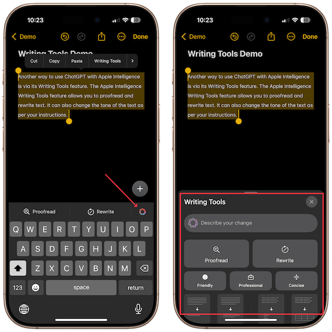 Another way to use ChatGPT with Apple Intelligence is via its Writing Tools feature. The Apple Intelligence Writing Tools feature allows you to proofread and rewrite text. It can also change the tone of the text as per your instructions.