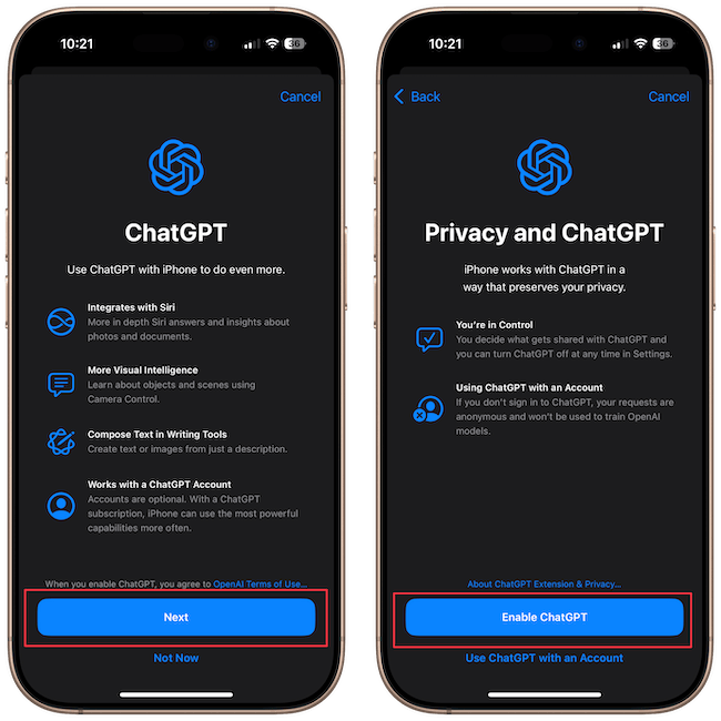4. You will see a few splash screens detailing the features and privacy. Tap Next and then Enable ChatGPT to proceed.