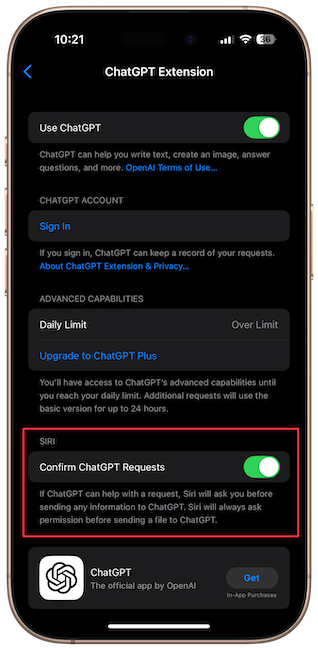 When you use ChatGPT with Siri, it prompts you each time before sending your request to ChatGPT. If you don’t want that to happen, turn off the toggle next to Confirm ChatGPT Requests. I keep it on because I want to know when my requests are sent to ChatGPT.