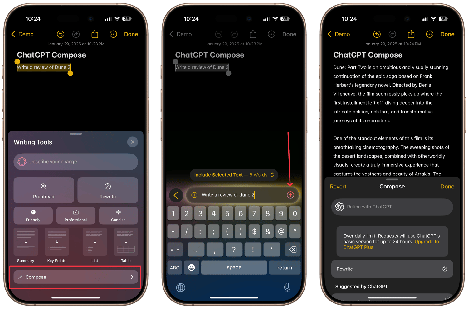 However, it cannot compose new text. That’s where ChatGPT can help you. In the Writing Tools pop-up window, you will see a Compose button. When you tap on it, you will get a Compose with ChatGPT option.