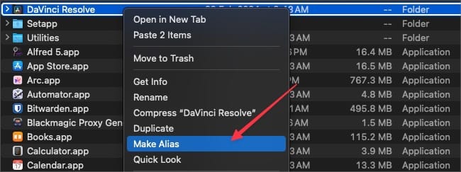 3. Right-click on the app you want to add to the folder and choose the Make Alias option.