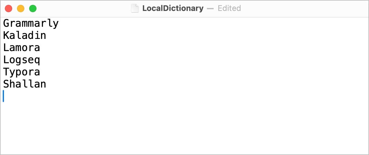 5. Now, add the words you want your Mac to learn and use ⌘S shortcut to save the changes. Remember to add only one word per line. Your file should look something like this.
