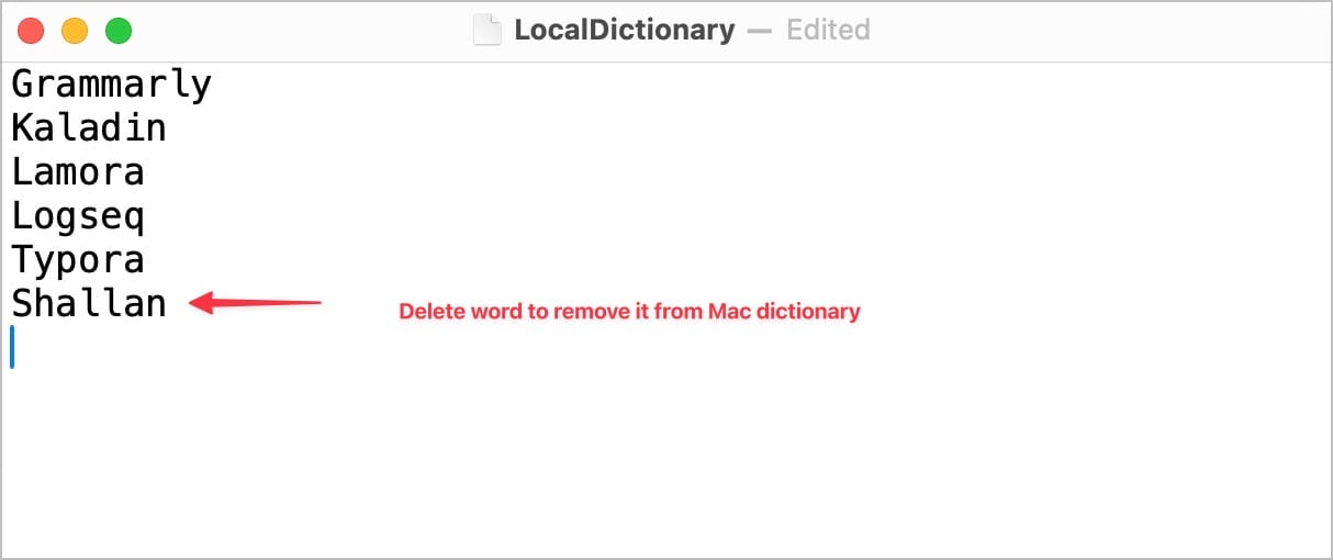 You can also use the same steps to bulk remove words from your Mac local dictionary. Simply delete the words you want to remove and save the file using the ⌘S keyboard shortcut. Now, restart your Mac.