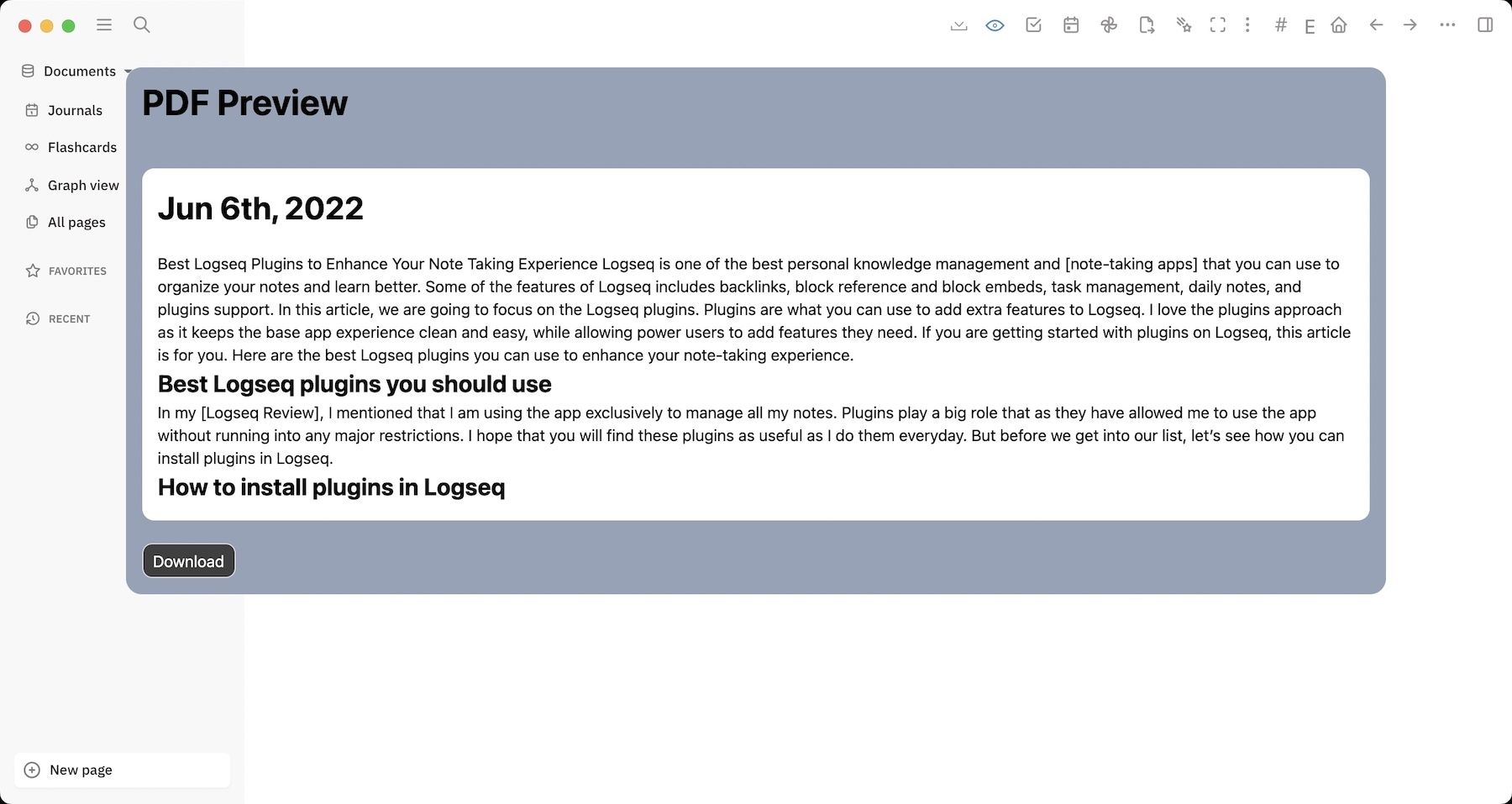 Logseq comes with a rudimentary export system that lets you export pages in text, OPML, and HTML formats. But what if you want to export a page into PDF or image formats. Thanks to the community, we can do this by using plugins. You can use these plugins to export a page into PDF, rendered HTML, and image formats.