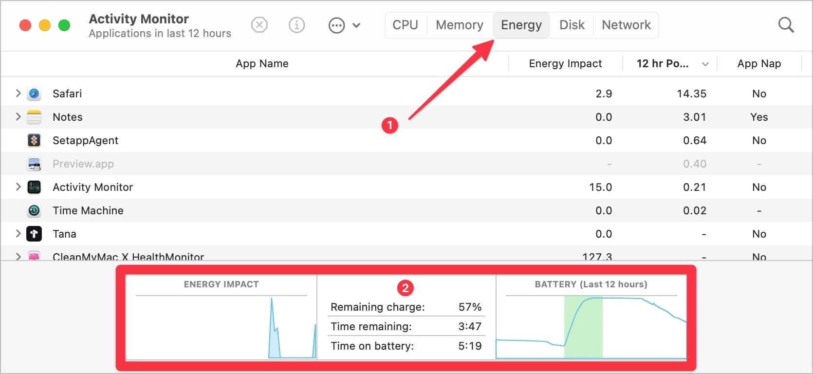 2. Click on the Energy tab, and you will see the remaining charge percentage along with the time remaining on the battery.