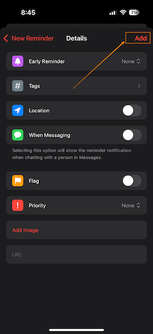 3. You can use the Details field to add tags, location, image, URL, and more. Once you have added all the details, tap the Add button to save the reminder.