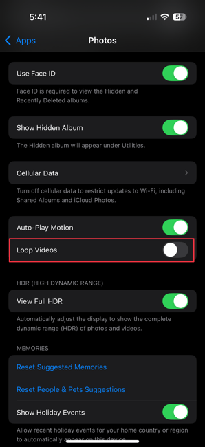 3. Scroll down to the Loop Video setting, and now videos will not autoplay on your iPhone.