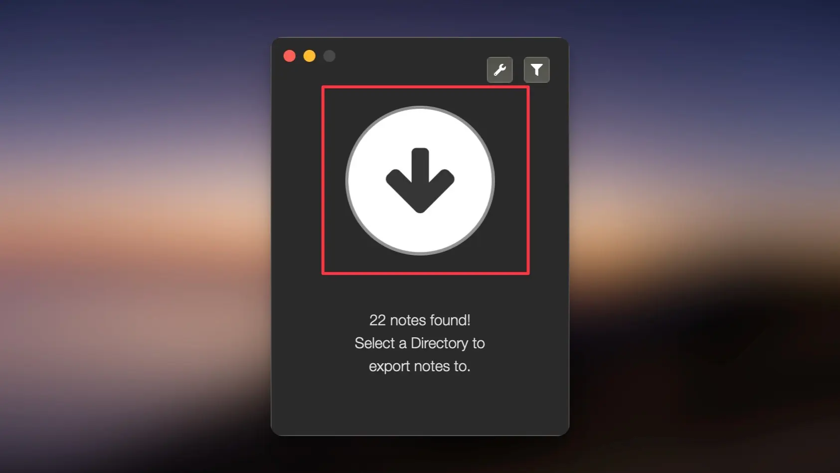 2. It will find all the notes, as shown in the screenshot. Click on the wrench icon to customize your export.
