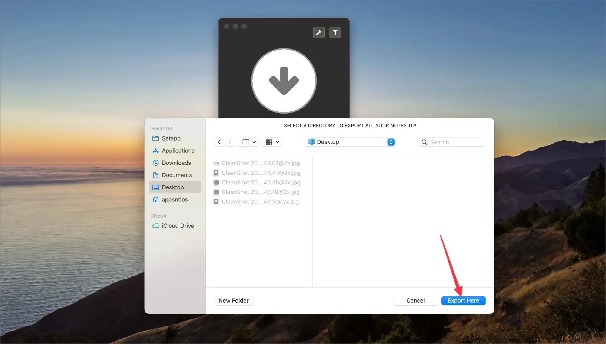 6. Now, click on the export button (down arrow) and choose the location where you want to export the files. Click the Export Here button to export.