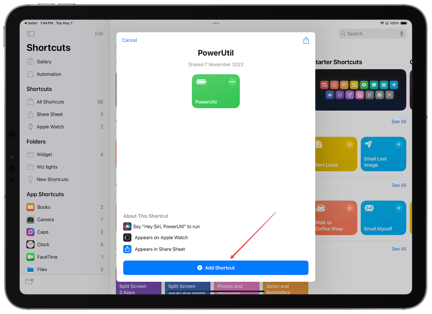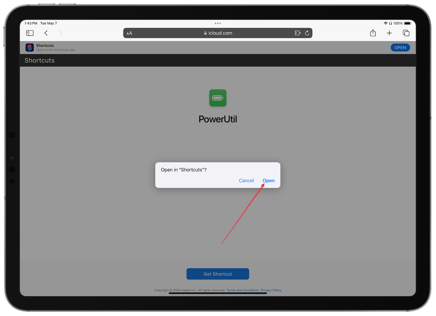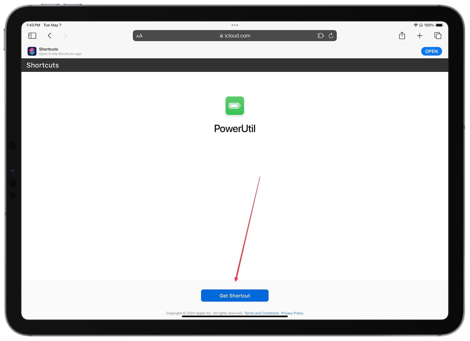 1. Click on the link to open the PowerUtil shortcut in Safari and tap on the Get Shortcut button.