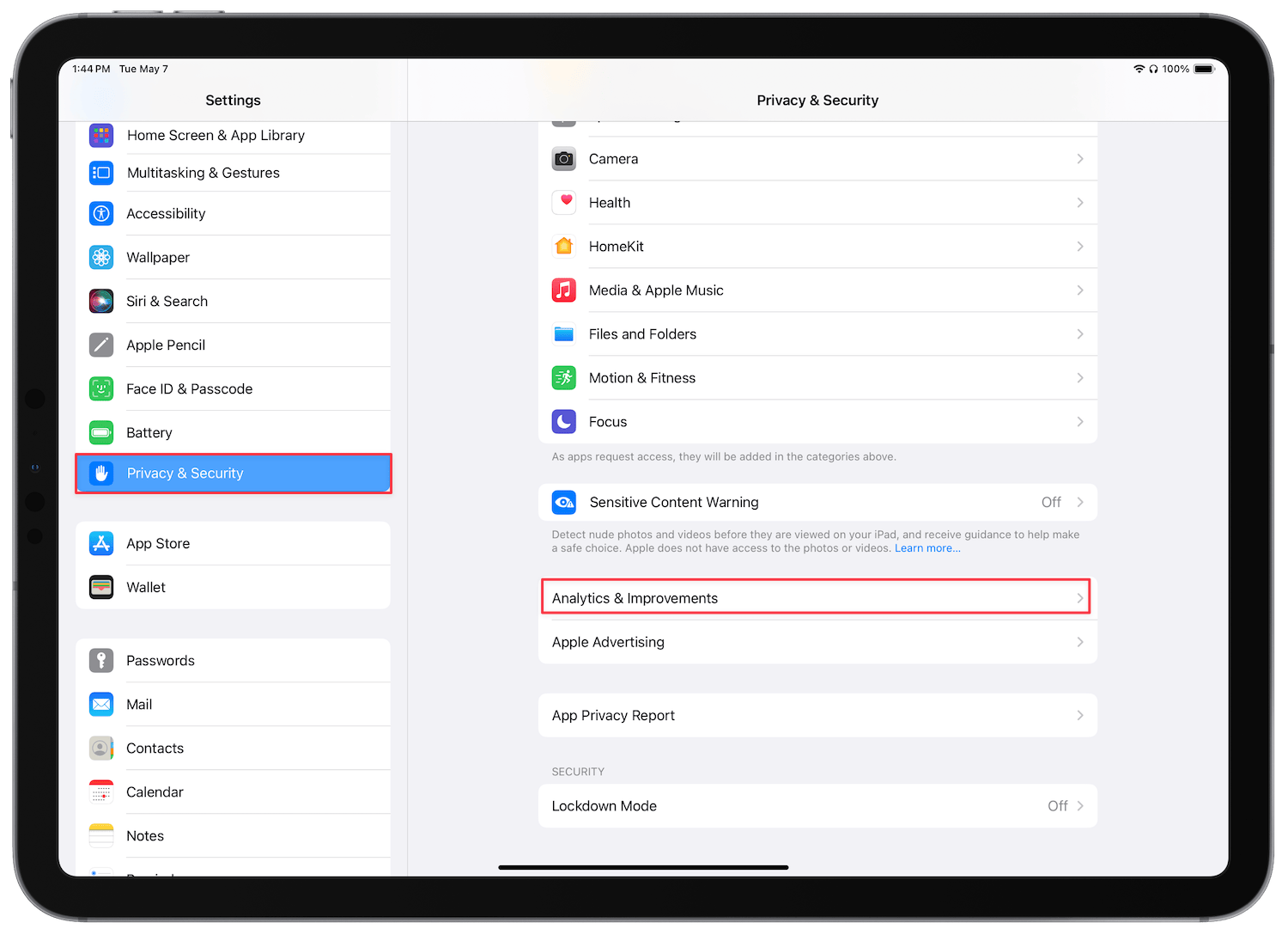 1. Launch the Settings app and open the Privacy & Security settings. Scroll to the bottom and open the Analytics & Improvements settings.