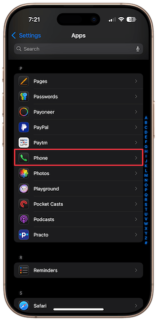 2. You will find all your apps in alphabetical order. Scroll to the Phone app and tap to open its settings.