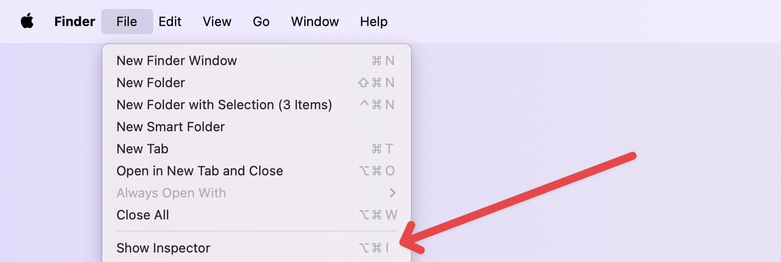 The problem with Get Info feature is that it is static and doesn’t change when you select another folder. You can solve this issue using the Inspector panel. To access this option, hold down the ⌥ (Option) key and open the File menu. You will notice that Get Info has been replaced by Show Inspector option.