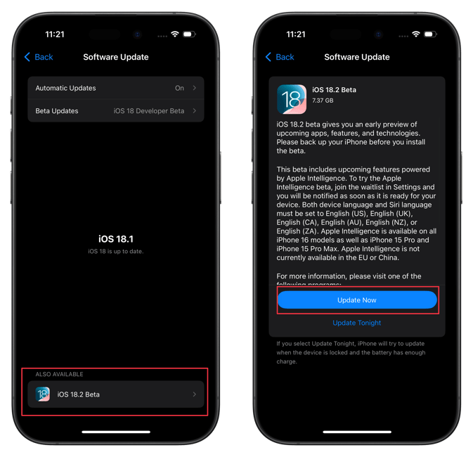 4. Again go to Settings → General → Software update and you should see an iOS 18.2 Developer beta option at the bottom. Tap on it and follow the on-screen prompt to install it.