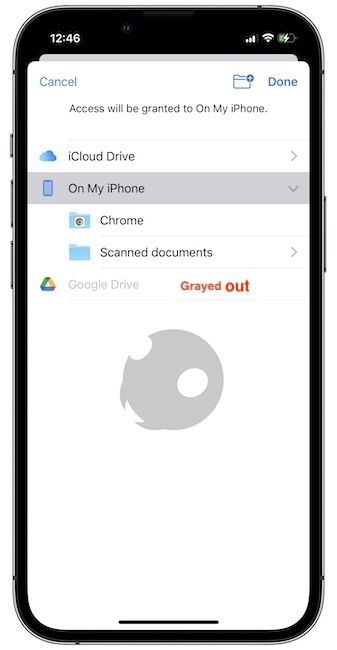 Even though the Files app integrates with third-party cloud storage apps, iOS doesn’t allow you to use them as a location for storing Safari downloads. As you can see in the screenshot below, the Google Drive icon is grayed out, which means you cannot select and use it as a download location for Safari downloads.