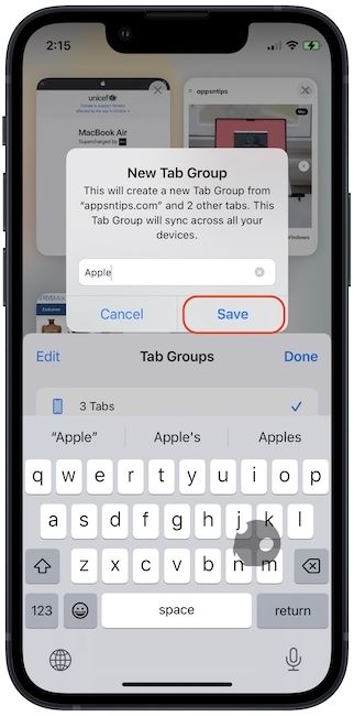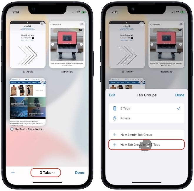 3. Tap on X Tabs at the bottom of the screen and choose the New Tab Group from 3 Tabs option.