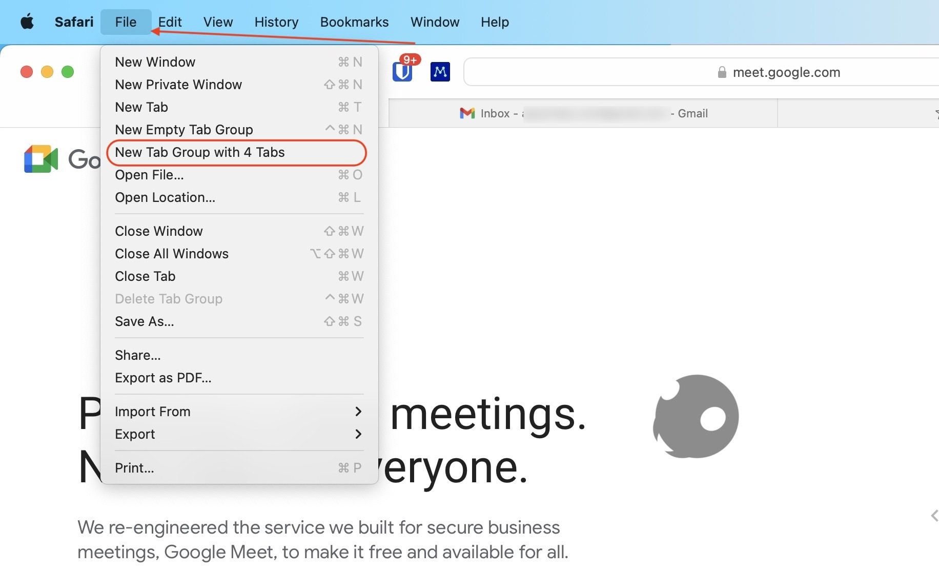 3. Click on the File menu in the Menu Bar and select the New Tab Group with X Tabs option.