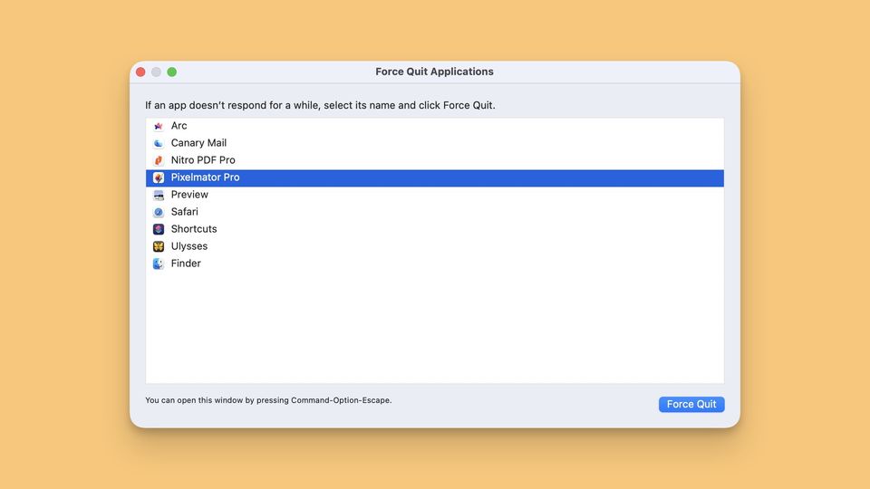 The easiest way to force quit apps on Mac is by using a keyboard shortcut. Like there’s a Ctrl+Alt+Delete keyboard shortcut on Windows, in macOS, you can use Option(⌥)+Command(⌘)+Escape(⎋) to bring up the force quit menu. Now, click to select the app you want to quit and use the Force Quit button to kill the app.