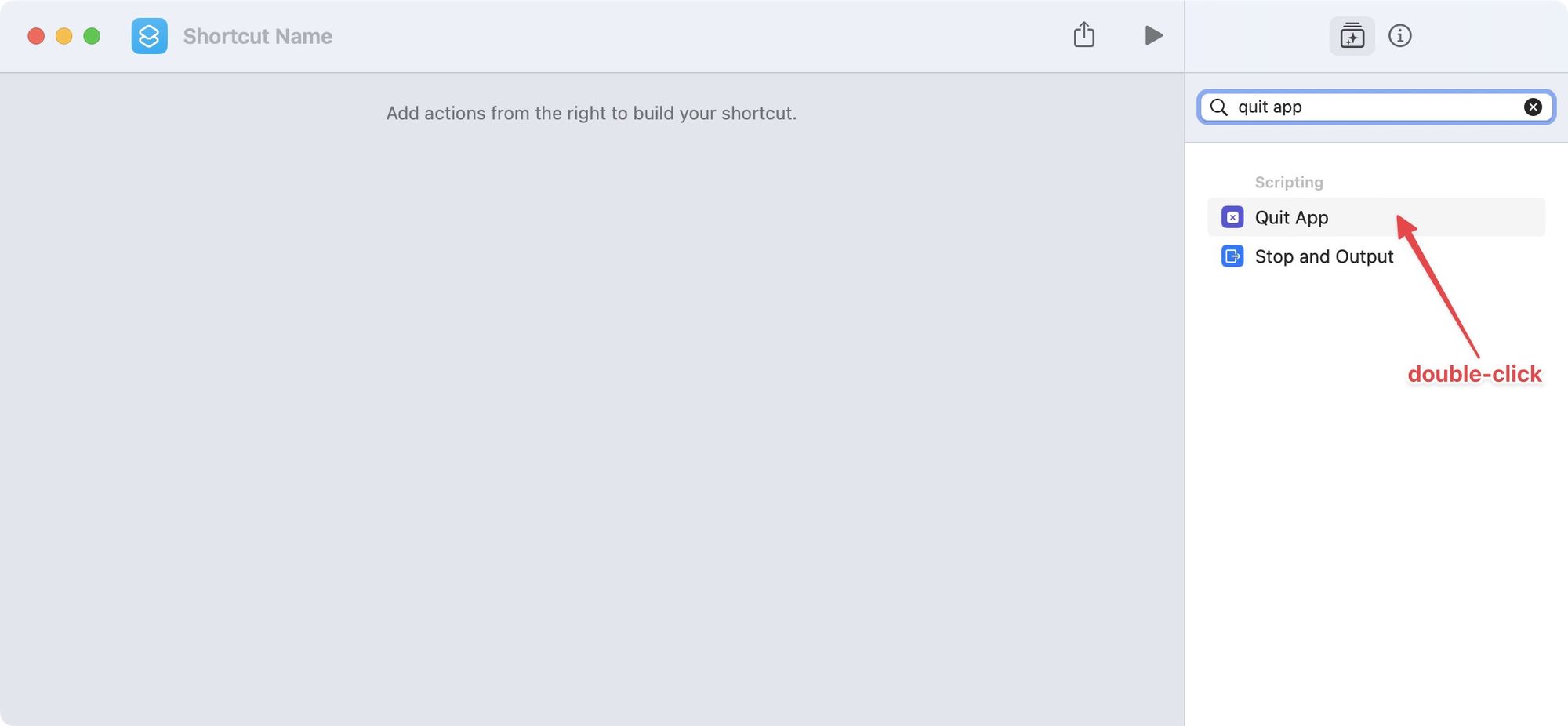 3. Use the search menu to search for the Quit App shortcut and double-click on it to add it to the workflow.