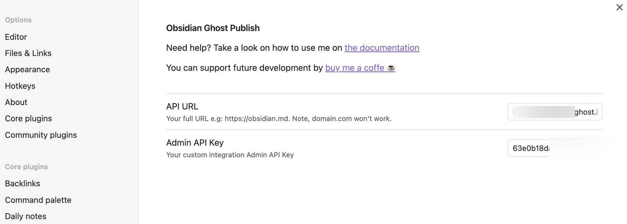 6. As you can see, you now need the API URL and Admin API Key to connect your ghost blog to Obsidian.