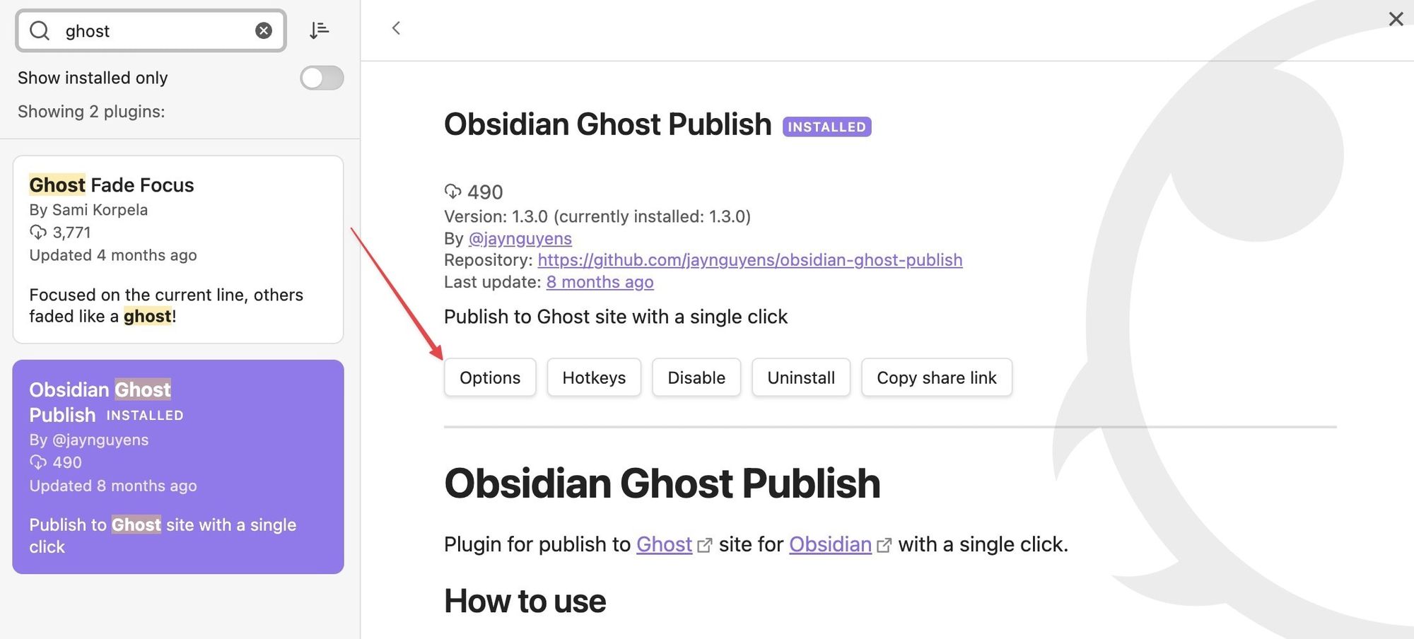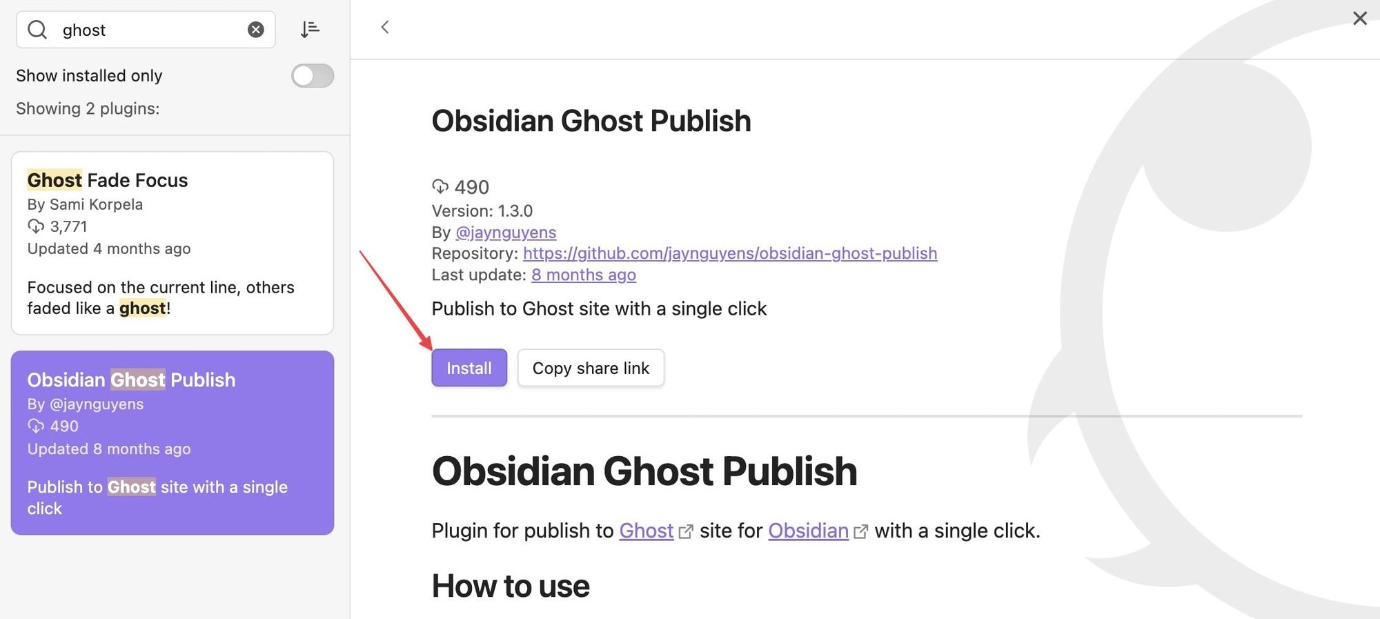4. Click on the Obsidian Ghost Publish plugin and use the Install button to install it.