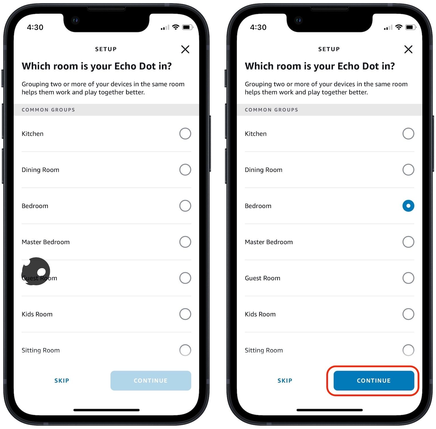 14. Now, you will be asked to choose the language and the room in which you have placed your Echo speaker. You might see some more non-essential setup screens. Tap on the CONTINUE button a few times to complete the setup.