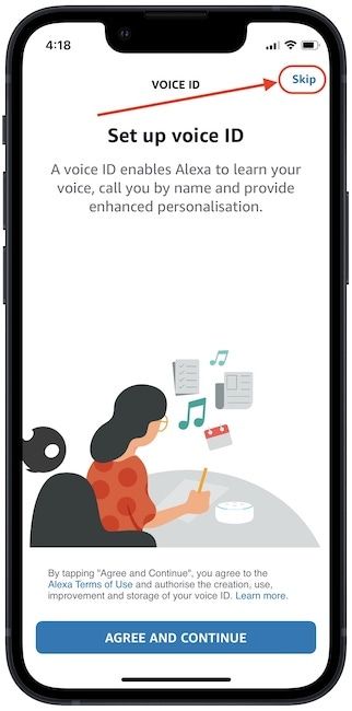 5 .The app will ask you to set up your Voice ID. A voice ID lets Alexa learn your voice and give personalized recommendations. You can set it up by tapping on the Agree and Continue button. For now, we will skip this step as it is not necessary for this guide.