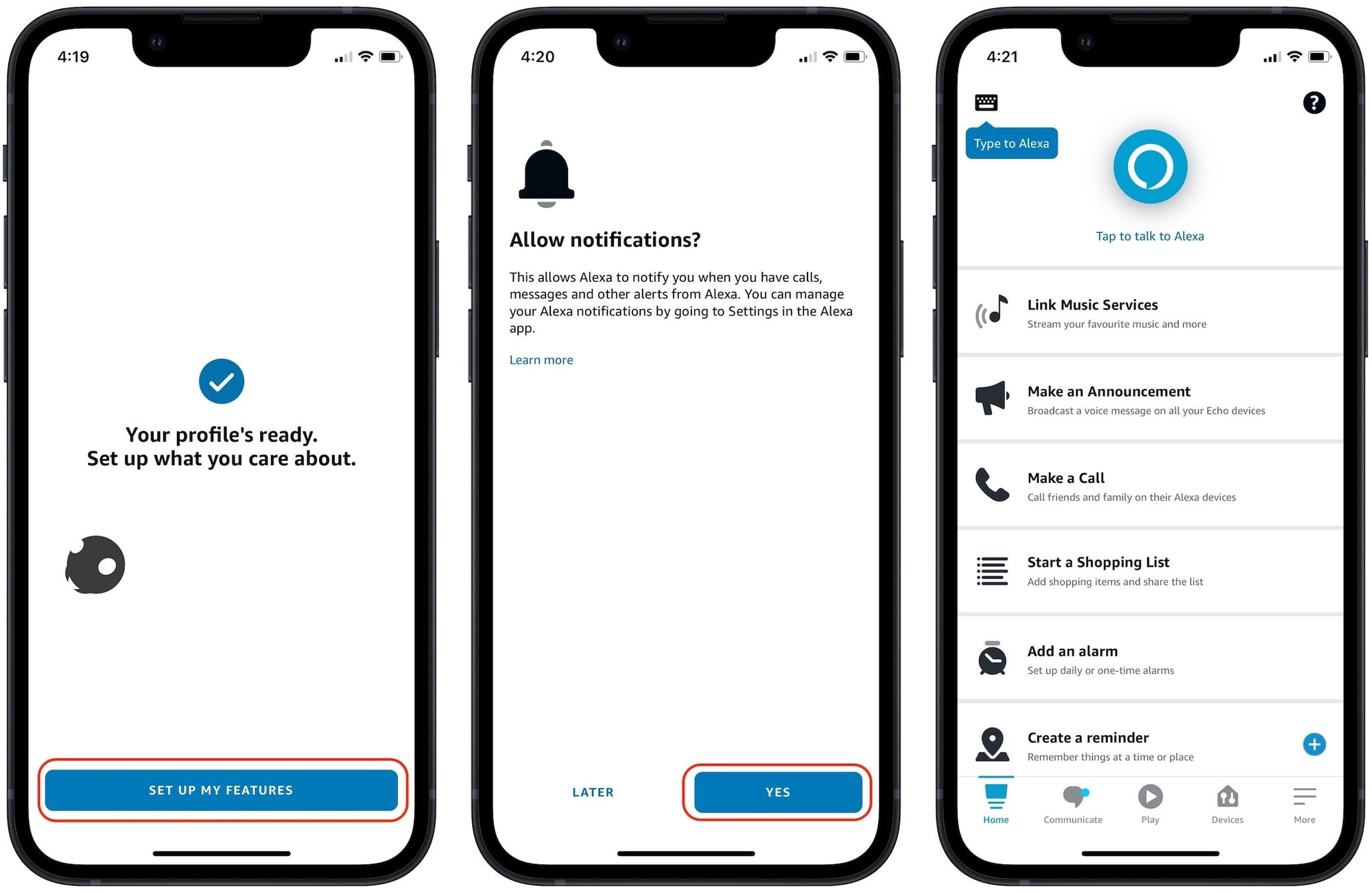 6. Tap on SET UP MY FEATURES to continue the setup process. Alexa app will also ask for notifications, contacts, and other permissions. Grant the permissions (or deny) until you reach the app's home screen.