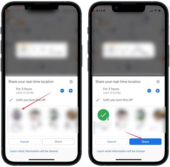 4. From the contact list below, tap to select the person you want to share your location with. Tap on the Share button to confirm.