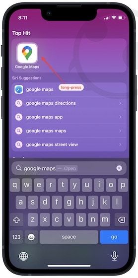 2. If Google Maps is not present on the Home Screen of your iPhone, you can use Spotlight to search for it. Now, long-press on the Google Maps search result.