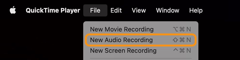 2. Click on the File Menu in the Menu Bar and select New Audio Recording. Alternatively, hit the keyboard shortcut CMD+Shift+N.