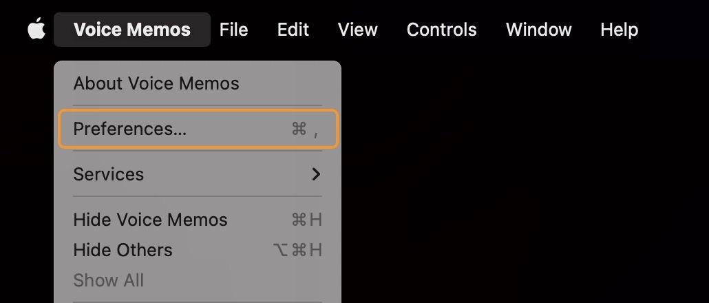 2. Before you start recording, hit CMD+, keyboard shortcut, or click on Voice Memos in Menu Bar and open Preferences.