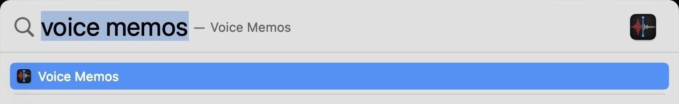 - First, launch Spotlight using the CMD+Space keyboard shortcut and then search for Voice Memos. Select and hit enter to launch the app.