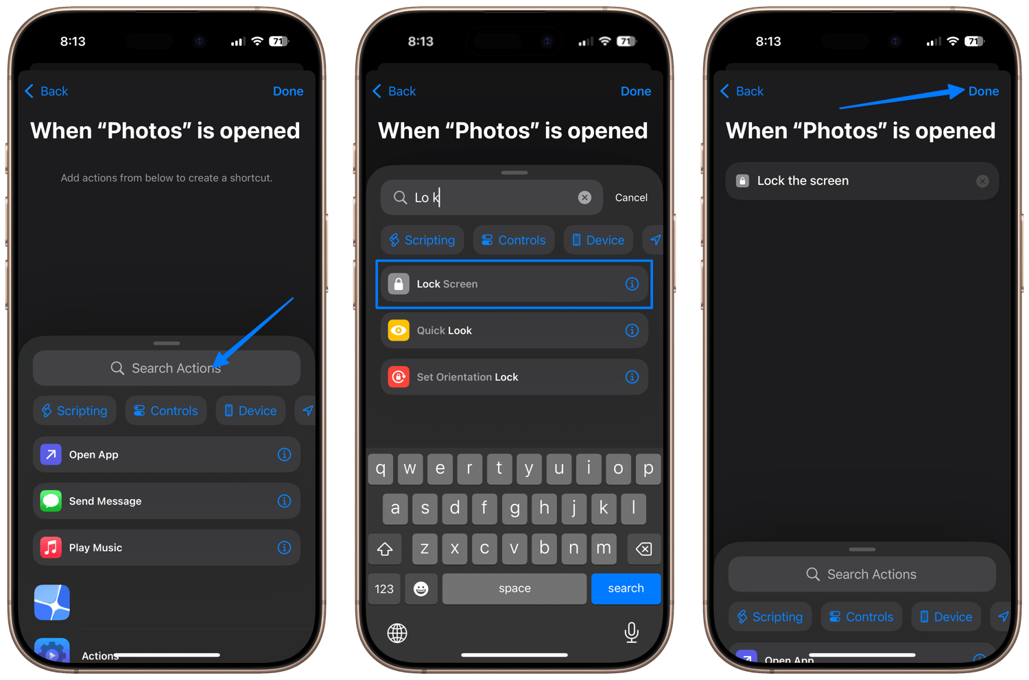 6. Now use the Search bar to find the Lock Screen action and tap to add it. Finally, tap the Done button in the top-right corner.