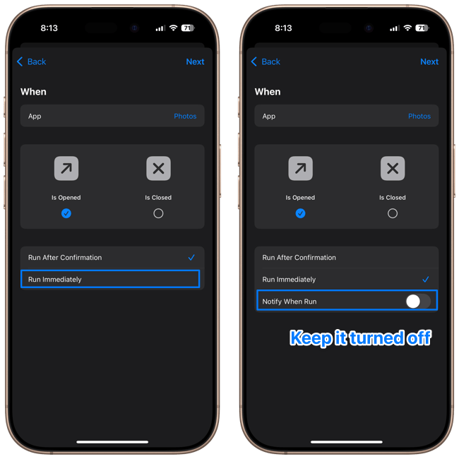 4. Select the Run Immediately option and ensure the Notify When Run option is turned off.
