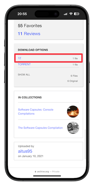 2. Scroll down to the Download Options section and tap on 7Z to download the file.