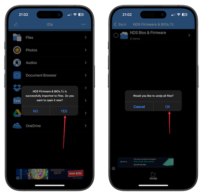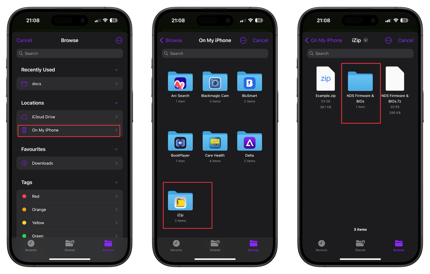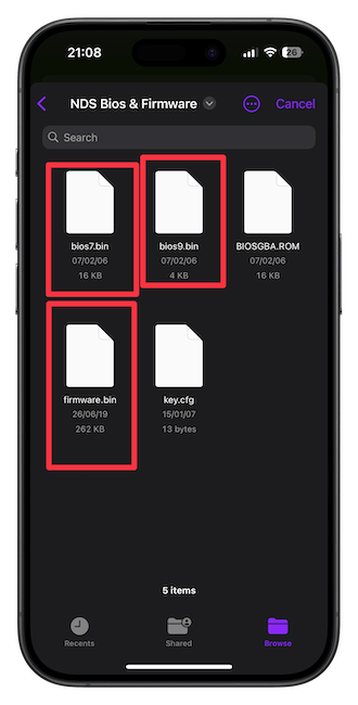 7. Go to On My iPhone → iZip → NDS Firmware & BIOS and choose the file with the same name.