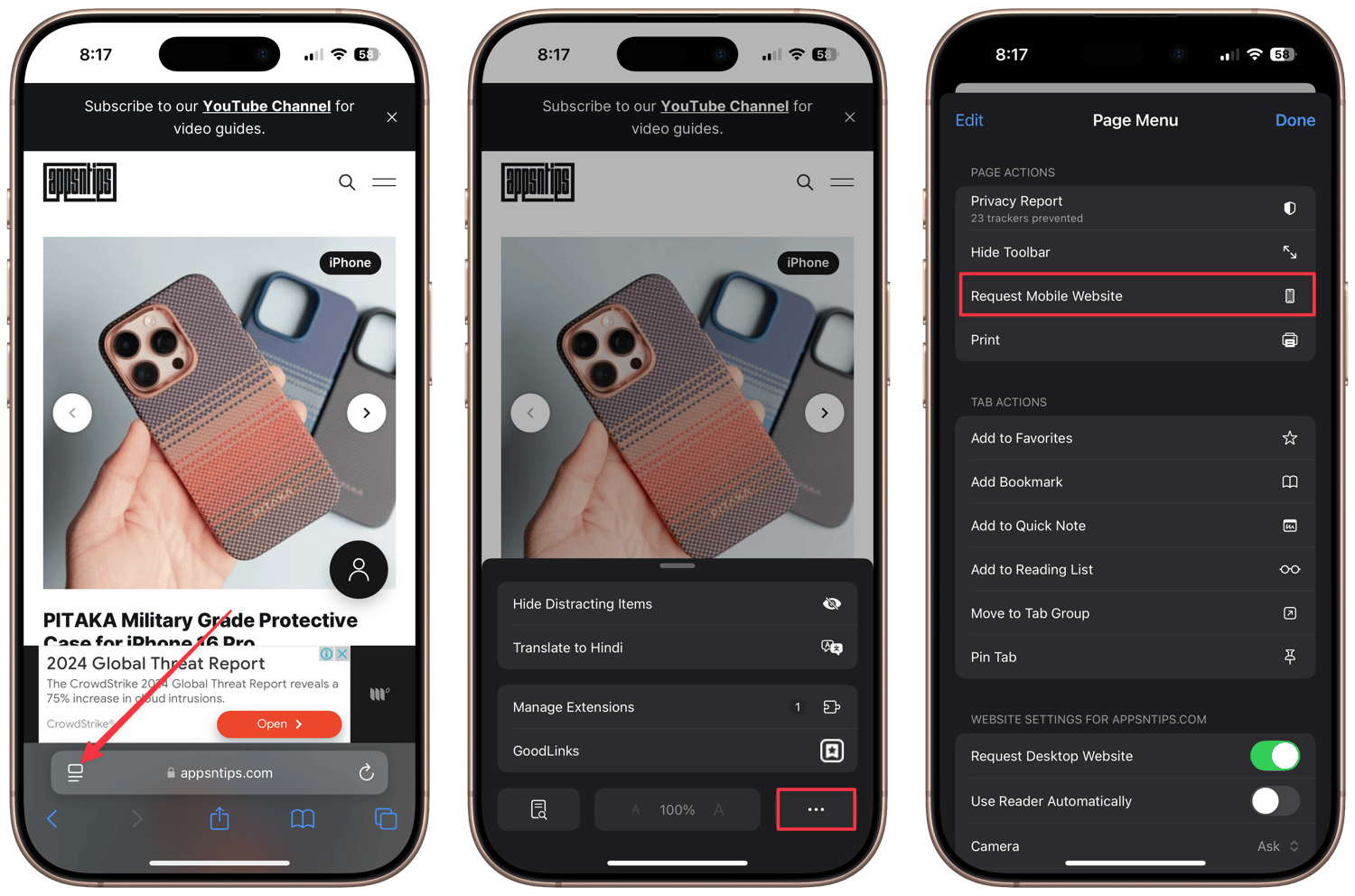 You can repeat the steps to go back to mobile view. Open the website in Safari and tap the Menu button on the left side of the URL window. Tap the three-dot menu and choose the Request Mobile Website option.
