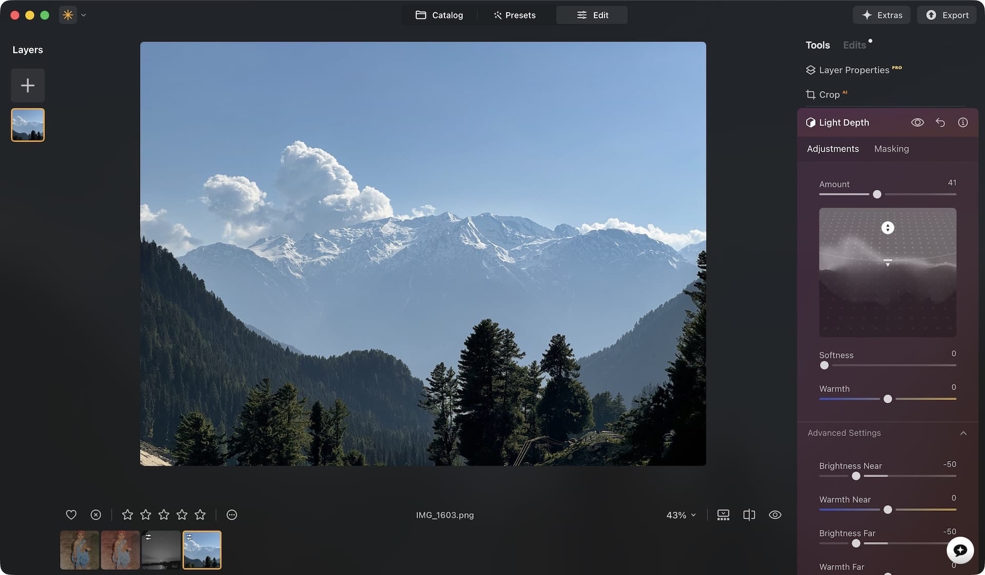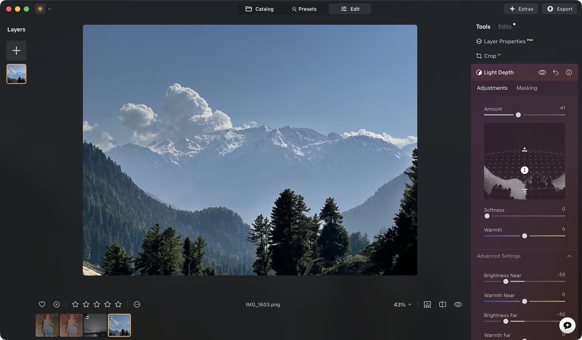 In my photo, the trees are dark and losing details. I can use the Light Depth feature to adjust the lighting and make them stand out. Here’s the before and after of the image, and it took me almost no time to edit it.