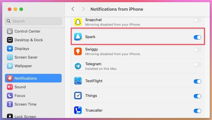 4. To solve the duplicate notification issue, go through the list of apps and turn off the toggle for all the apps installed on both your Mac and iPhone. Since I have issues with Spark, I will disable the toggle next to it.