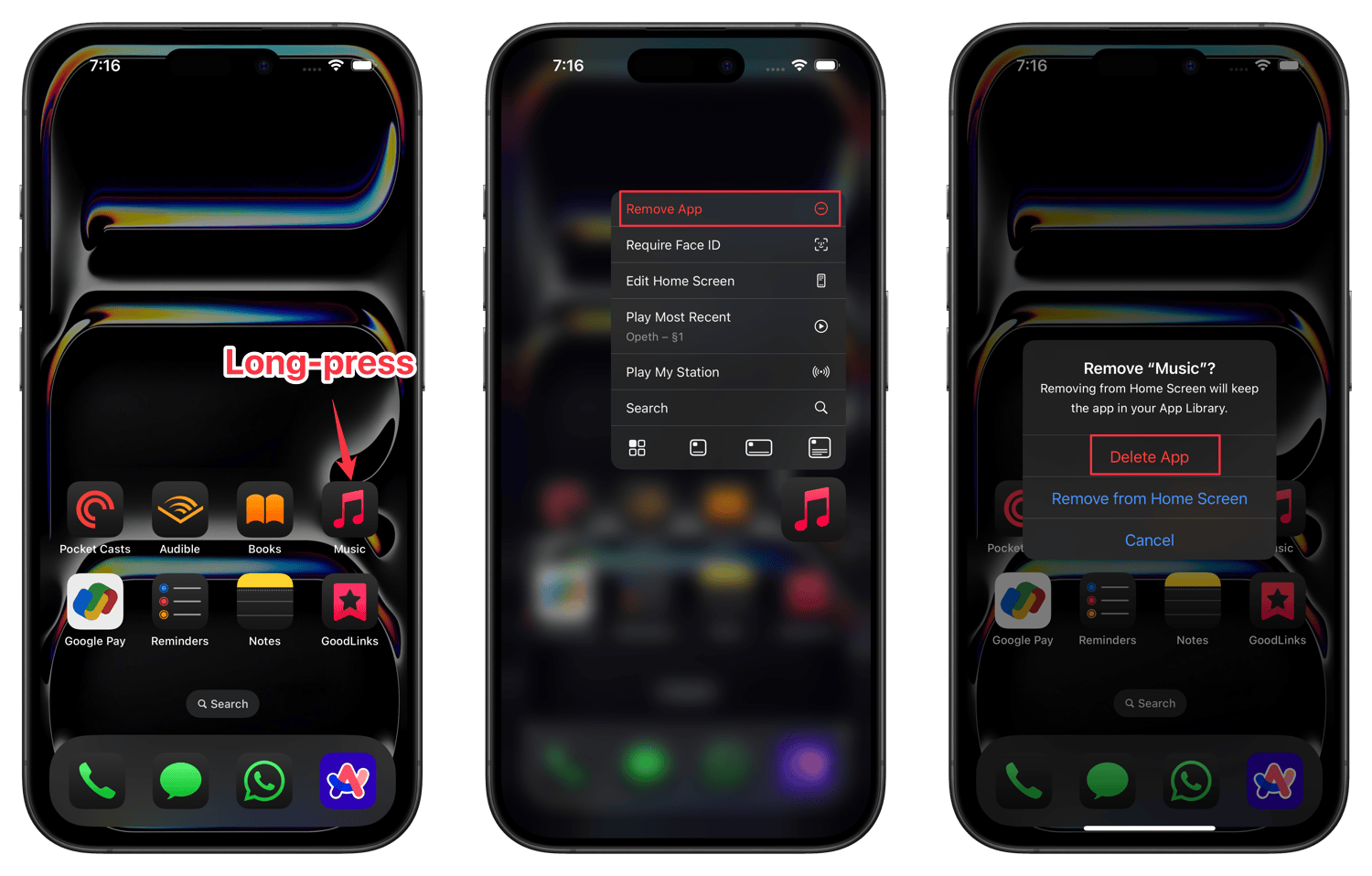If you don’t use Apple Music or Apple Podcasts app, the easiest way to solve this issue is by uninstalling these apps. To do that, long-press on the app icon, tap on Remove App, and use the Delete App action.