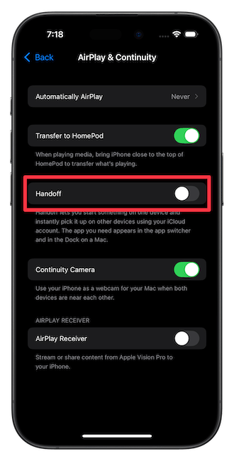 I don’t recommend turning off Handoff as it breaks the continuity features on your Apple devices which I quite enjoy.