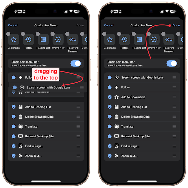 5. Hold and drag the Search screen with the Google Lens menu item to the top, and tap the Done button to save changes.